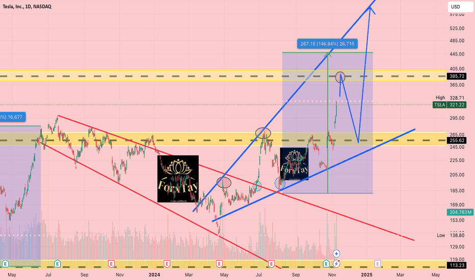 Elon Musk has been the key pillar of President Trumps campaign, now that the outcome is clear investors should see an end to federal law fare against Musk's from X and Neuralink and TESLA INC. Expected tariffs against China should give Tesla ample room to prepare its next lineup of affordable EVS such as Model 2, without having to resort to aggressive profit cutting. If Tesla materializes its robotaxi served by robustly implementing FSD,TSLA stock price could turn out to be at ban extreme discount at present so keep buying in as these factors are yet to be priced in. The company crossed the $1tn valuation for the first time in more than 2 years. TECHNICAL: on the weekly time framed we are faced with short end w pattern with the resistance of 385 this is the area we may see it retest/ reverse back to the neckline /support of 266-250 then from here it can continue going up again. this is also trending in a bullish pennant signalling major bullish signs.