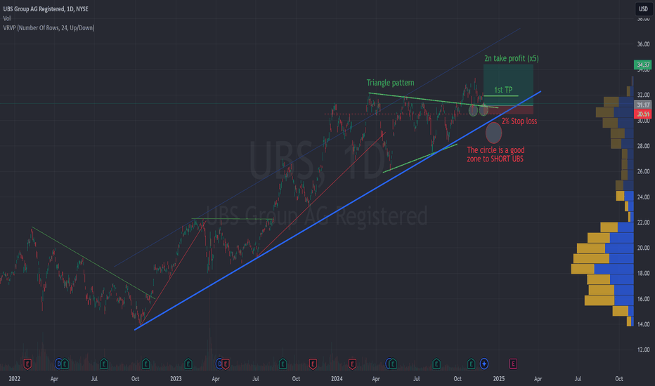 🟢 UBS offers a great trading opportunity (+10% returns) UBS is offering today a 10% returns or more opportunity risking just 2% in the deal. Furthermore, UBS has multiple patterns supporting this. As a bonus point, I will explain how to do this trade RISK-FREE. ✅ What pattern is unfolding in UBS? UBS formed few weeks ago a triangle as a continuation pattern. After the break of the pattern UBS returned a 6% in 1 month . Now we are in a pullback to the previous resistance level of the pattern, which is now a support. Here, we have the chance to buy, use a tight stop loss under the support line of the previous triangle (green) and under the previous minimum done few days ago. 💰 How to trade this chart pattern? Buy near the support green line with a tight stop loss, probably around 2%. You can potentially earn more than 10% if the pullback to the pattern works. If the trade falls under the blue line, we will enter an important bear market in UBS, but if that happen you would have done a SL of 2% and you will be ready to trade a SHORT with a massive and fast return. 🛡️ The risk management strategy As we have done in so many previous ideas, remember you can split the position in 2. - 50% of the position in a take profits as large as your stop loss (adapt SL and this 1st TP to local supports/resistance levels). In this case, a 2% (see the chart) - 50% of the position to a price as large as the previous pattern, which would mean a profit of 15 to 20%. Anyway, to increase our chances to arrive to the second TP, we recommend using a 10% take profits. The second TP is less likely to happen, but as soon as the first one has been reached (extremely high probability), this becomes a RISK-FREE TRADE. ✴️ ENJOY AND FOLLOW for more 😊